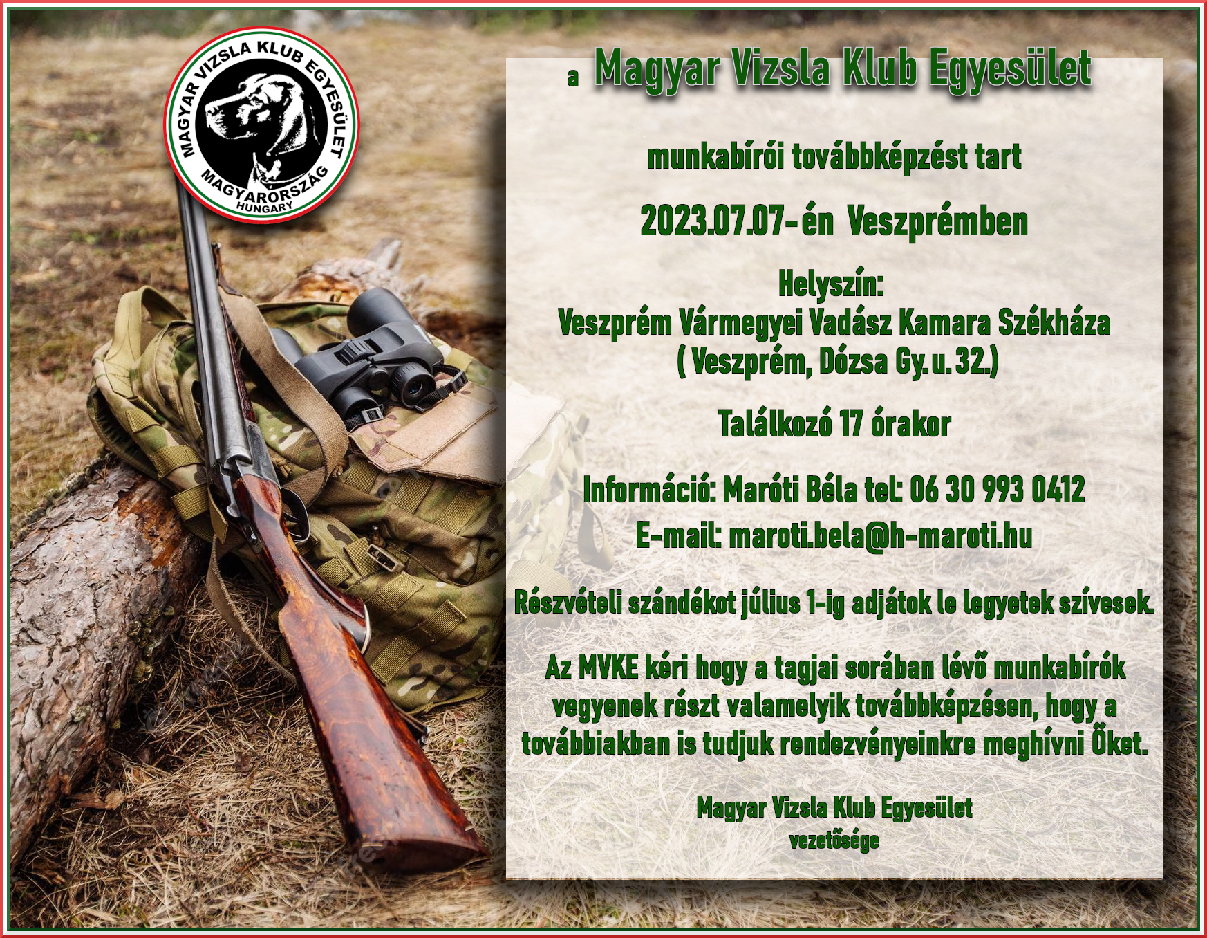 A szakmai hétvégén való részvétel a vadászkutya teljesítménybírói továbbképzés része. Az érvényes 2023. évi MEOESZ szövetségi tagkártyával rendelkező munka teljesítménybíróknak INGYENES.